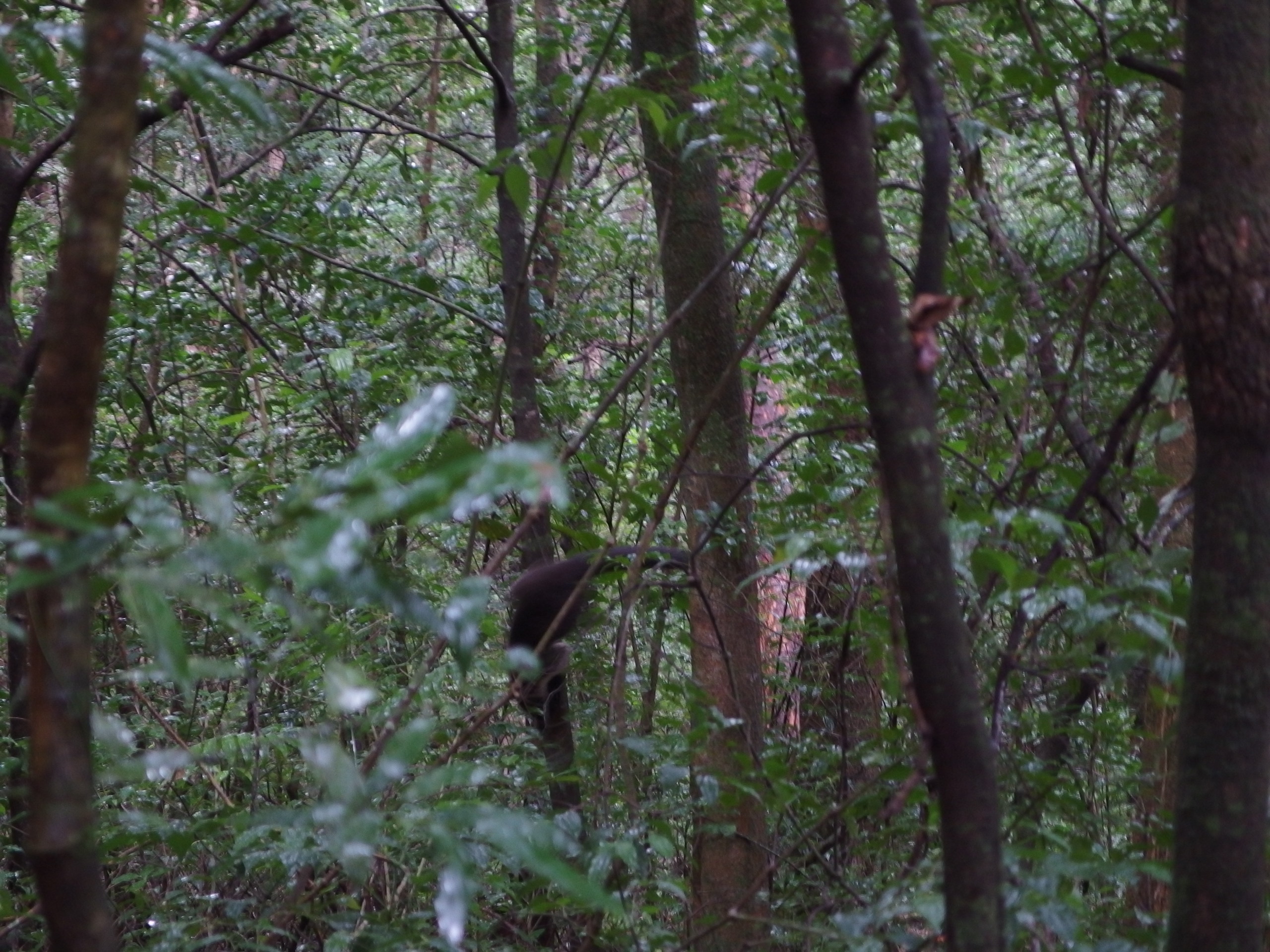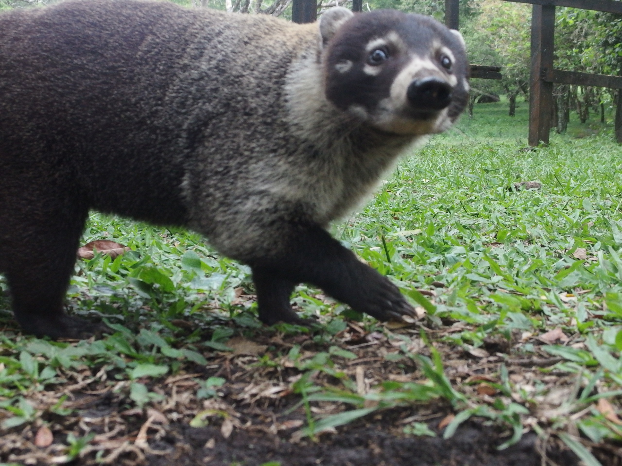 Wir hatten uns vorgenommen, dass wir flüstern, damit wir vielleicht ein paar Tiere sehen. Eigentlich haben wir es mehr zum Spaß als aus Überzeugung gemacht, aber nach einer halben Stunde sehen wir eine drollige Großfamilie von Nasenbären. Schnelle und galante Läufer, die einer nach dem anderen unseren Weg kreuzt. Die Kamera natürlich im Rucksack verstaut, weil es immer wieder ordentlich regnet, wird hektisch rausgekramt. Da noch einer und weg…wieder einer noch einer, da wieder einer… Karo kramt nach der Kamera, wieder einer, dann zweie und noch einer. Es wird knapp, einen haben wir so gerade noch erwischt. Besonders lustig ist aber ihr Verhalten, wenn sie einen Feind in ihrer Nähe vermuten. Ich konnte nicht anders, als mich in ihrer vermuteten Nähe zu räuspern und ca. 10 von ihnen sind mit einem beherzten Satz die ersten 1,5 Meter des nächsten Baumes gesprungklettert. Reise nach Jerusalem für Nasenbären. Wir warten kurz und sie verlassen den sicheren Raum. Fotografieren kann man es leider nicht, da das Unterholz zu dicht war, aber weil ich kaum glaubte was ich sah, räusperte ich mich noch mal und sie wiederholten ihre Prozedur. Süß und wieselflink. Wie unglaublich süß sie sind werden wir später noch viel deutlicher erfahren.