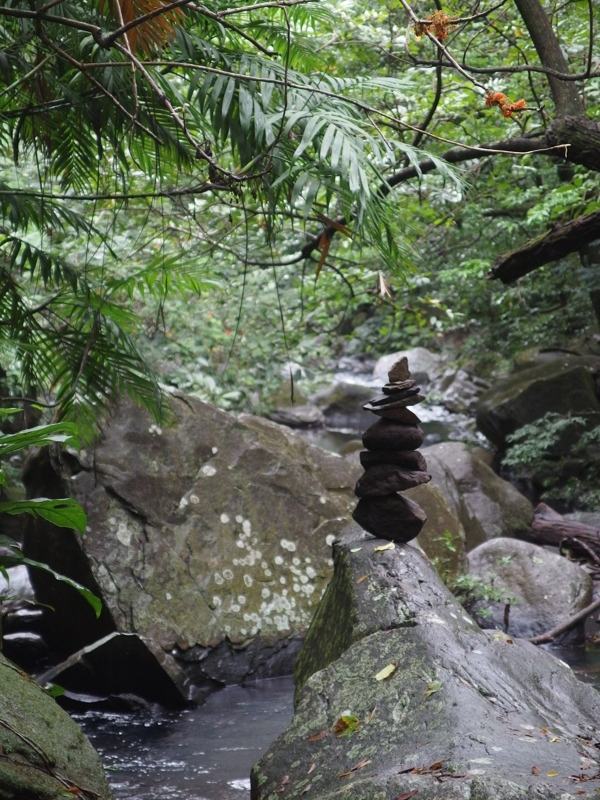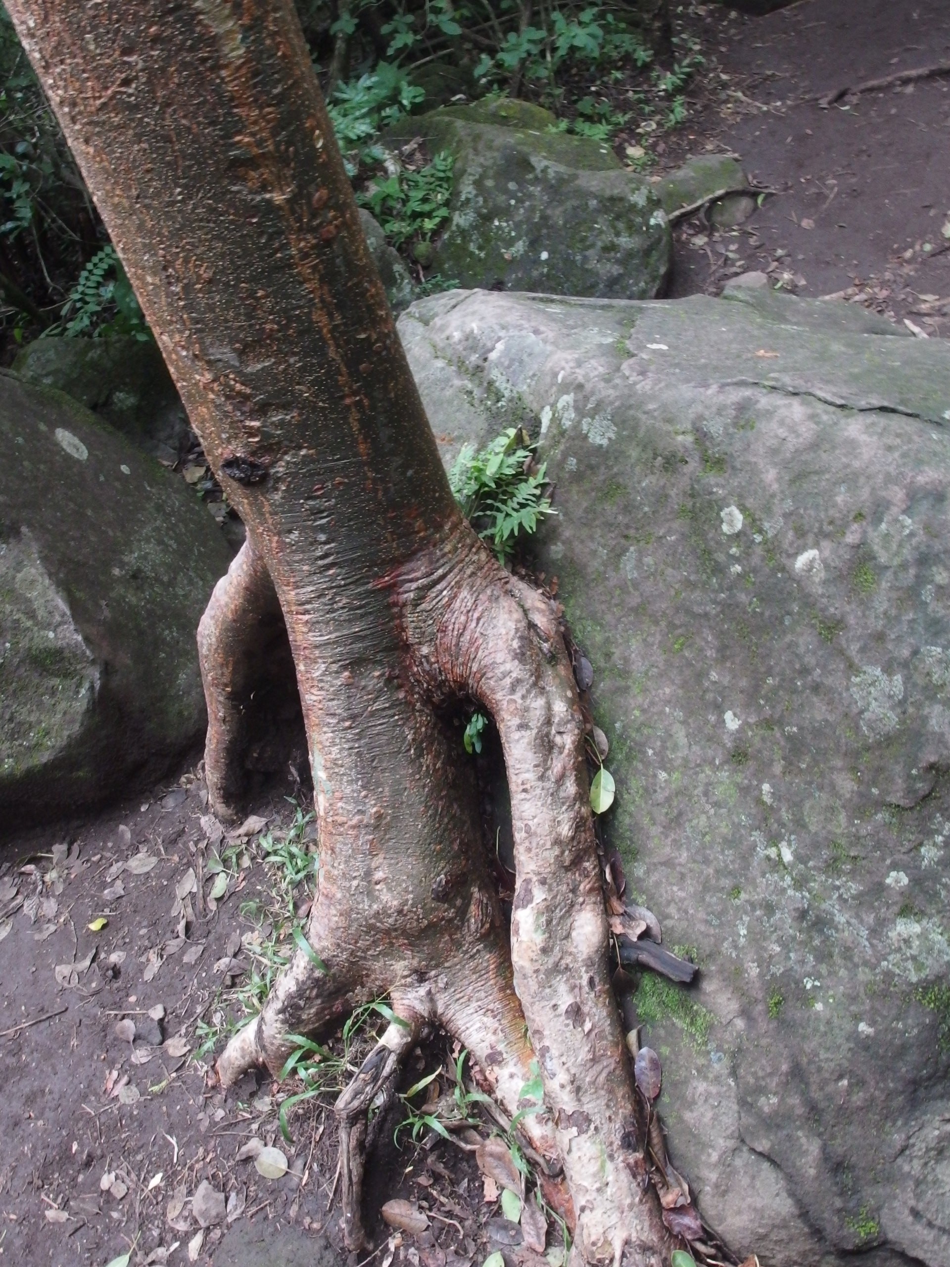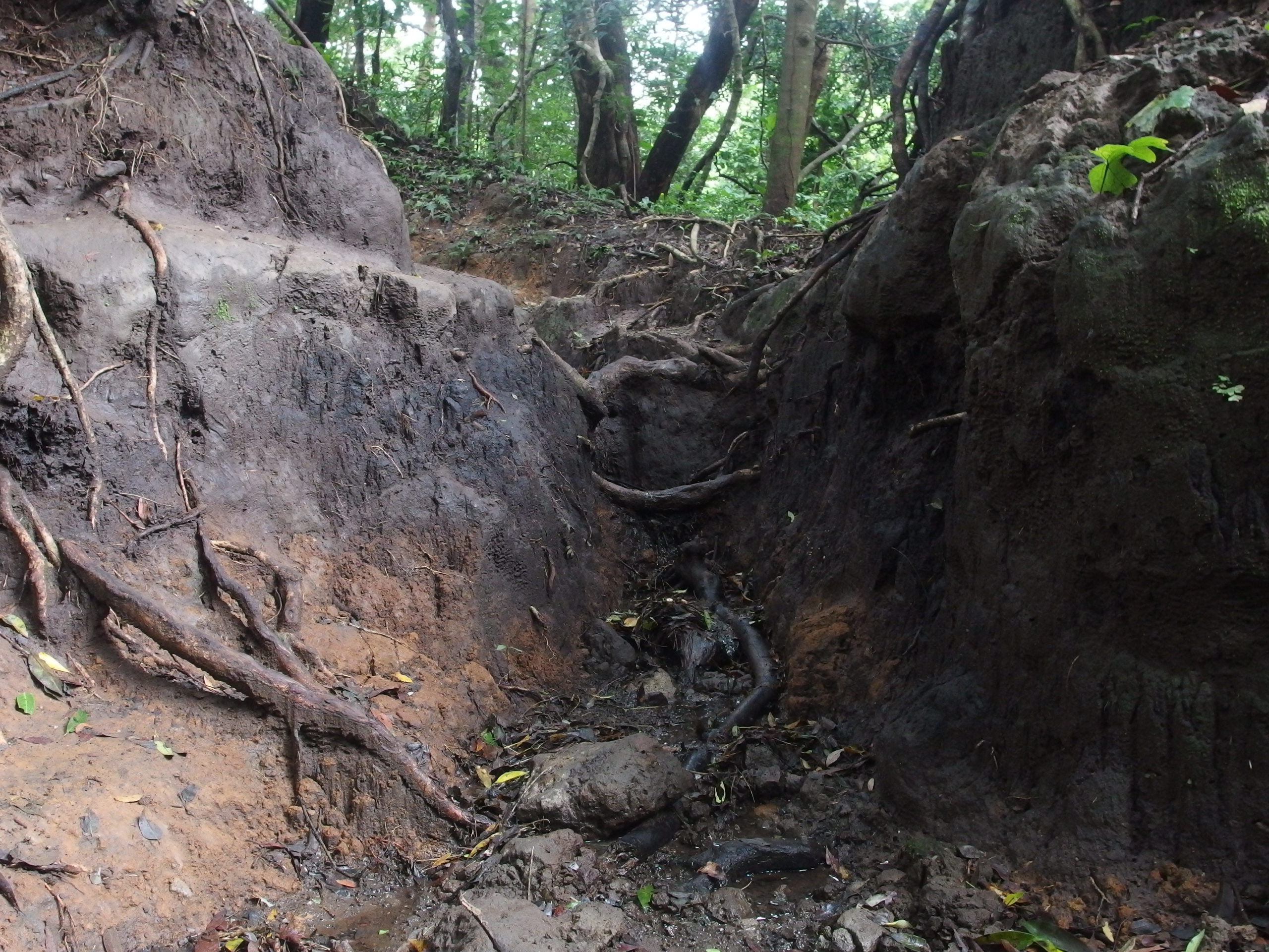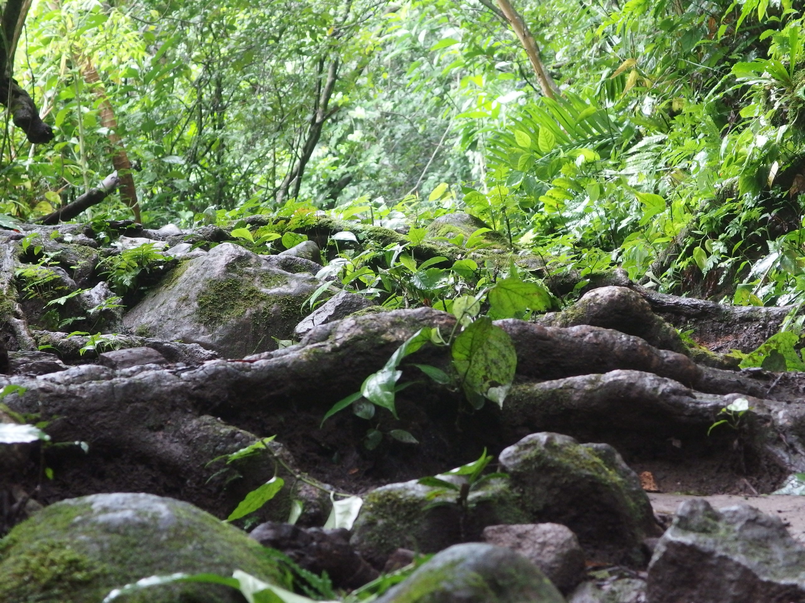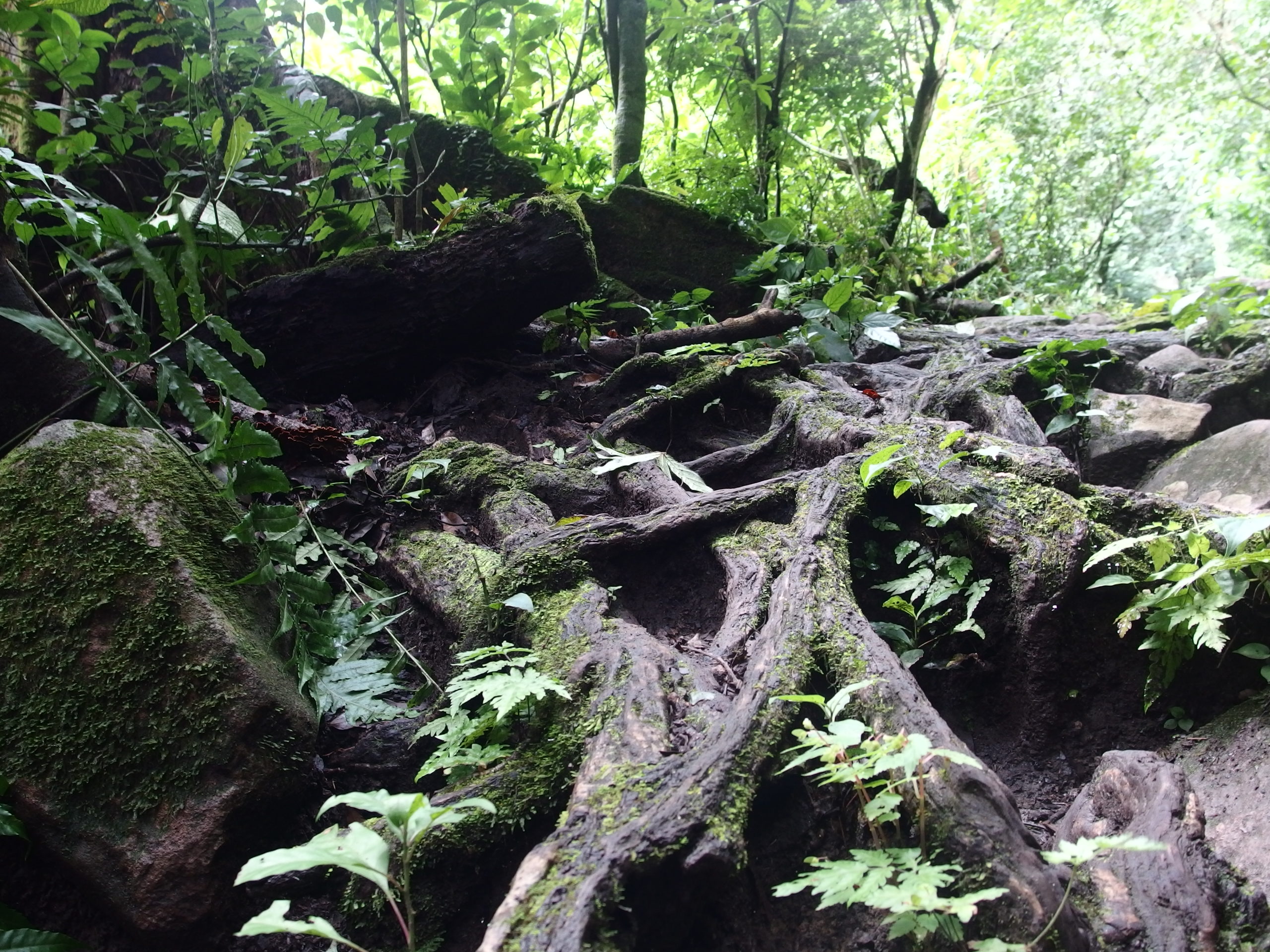Es ging über Stock und Stein, rauf und runter und hin und her und nicht vergessen wieder rauf und runter. Der Weg verlief kaum über einen normalen Weg sondern glich eher einem alpinen Gelände – nur im Dschungel eben. Manchmal wurde der Dschungel kurz unterbrochen und man lief über einen Weg umsäumt von weitläufiger Wiese mit vereinzelten Bäumen. Verrückt wie abwechselungsreich die Natur hier ist.