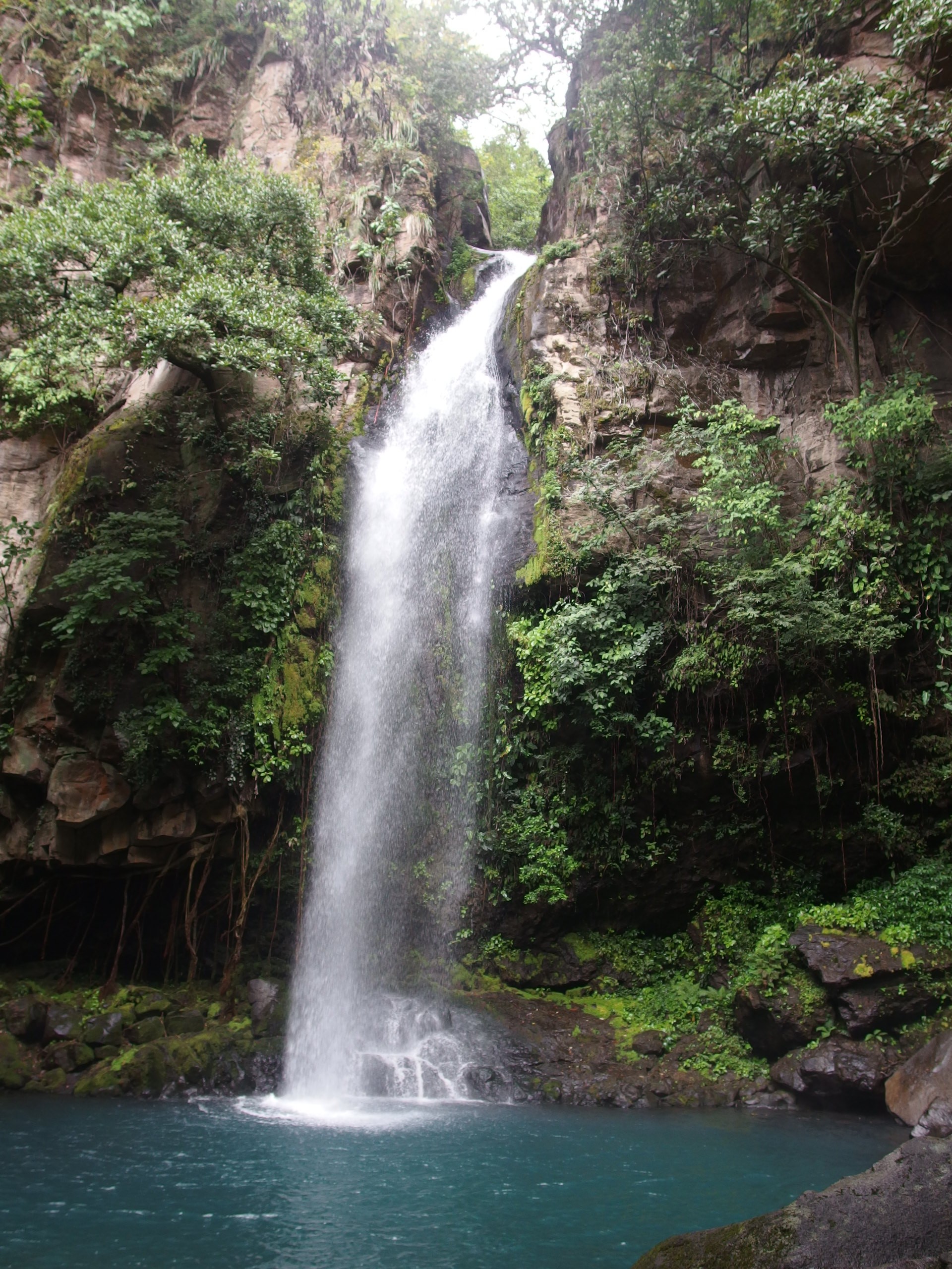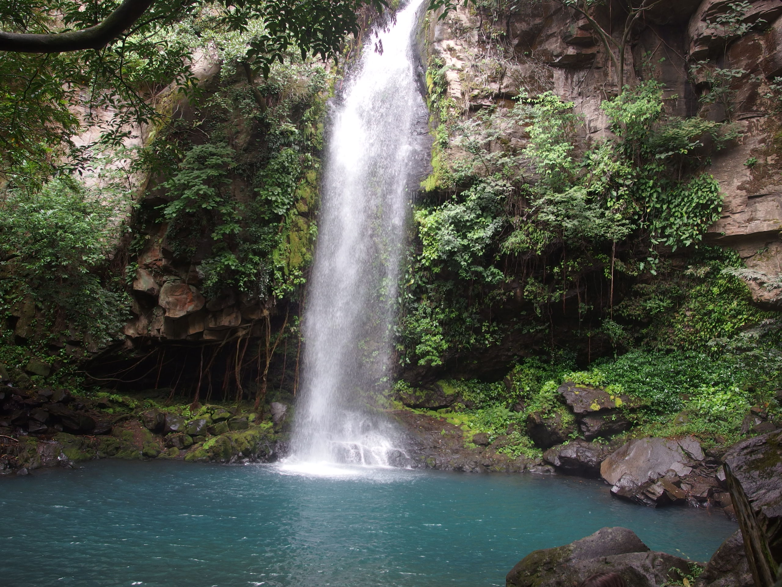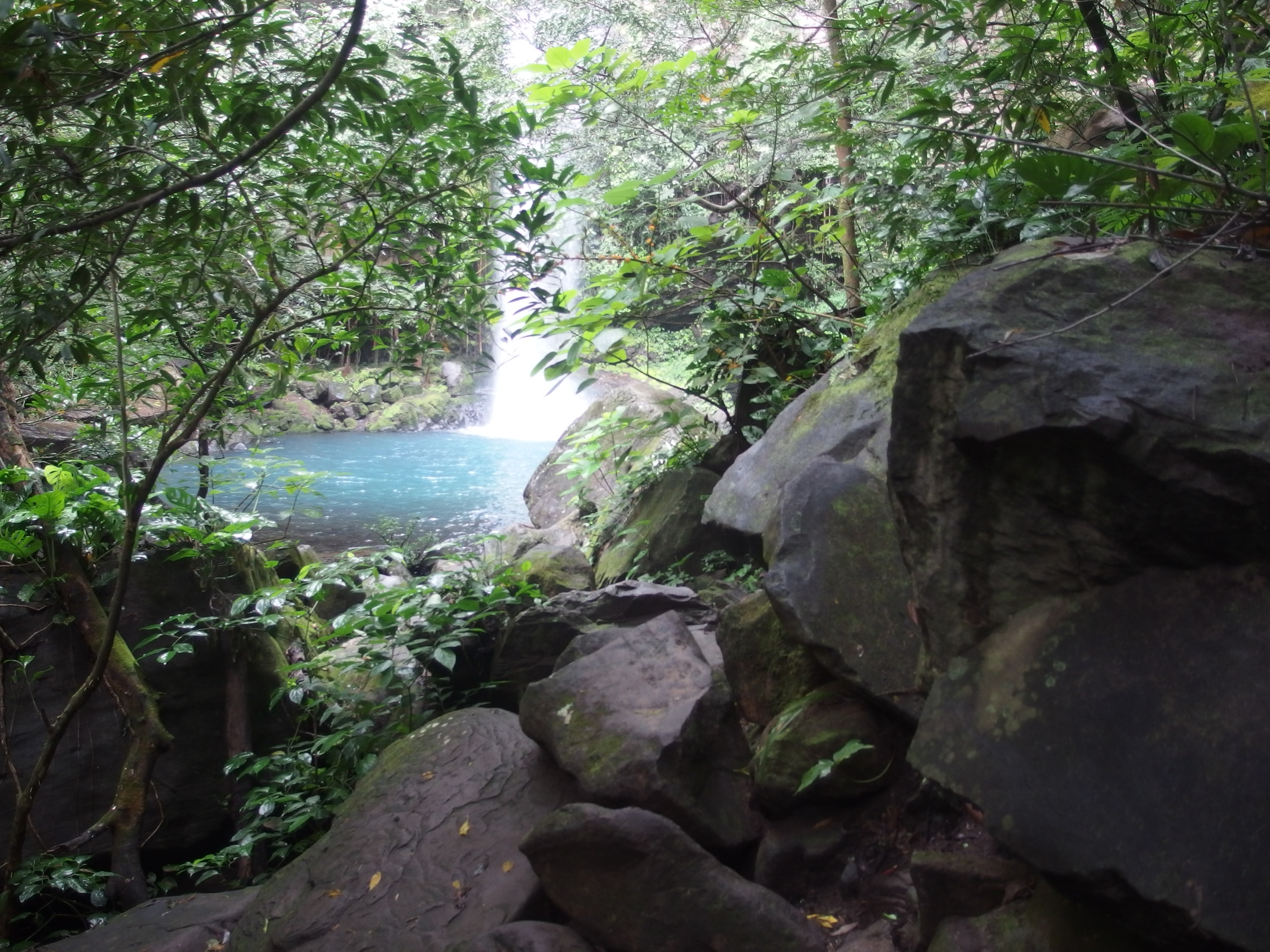 Ich habe selten einen Ort lieber verlassen als dieses Gefägniss, was ich vom Ricon de la Viaja nicht behaupten kann. Dieser Tagestrip soll etwas besonderes sein. Es geht zu einem Nationalpark – wie sollte es anders sein – der mit Vulkanattraktionen und einem Waserfall, wie von einer Postkarte lockt. Das Wasser azurblau und angeblich kann man drin schwimmen. Wir haben einen Einheimischen als Fahrer angeheuert, der uns gut zu unterhalten weiß. Wir üben zählen bis 100 und er stellt wahnsinnig viele Fragen. Eigentlich wie alle Ticos. Ein sehr neugieriges bzw. wissbegieriges Volk. Woher wir kommen, will er wissen und ja auch er stellt fest, dass wir Fußballweltmeister sind – es muss sich irgendwie rumgesprochen haben. Er mochte unser Team und – oh Wunder – wie wir Brasilien vernichtet haben. Es fiel wieder ein Panzervergleich für unsere Spielweise. Und man glaubt es kaum ich konnte teilweise in Spanisch antworten. Auf der Rückfahrt, so viel vorab, hat er den Schwierigkeitsgrad erhöht und von Englisch auf Spanisch umgestellt – aus einem Dialog wurde so mehr ein Monolog – gut das er wieder bis 100 gezählt hat, so haben wir wenigstens das verstanden.